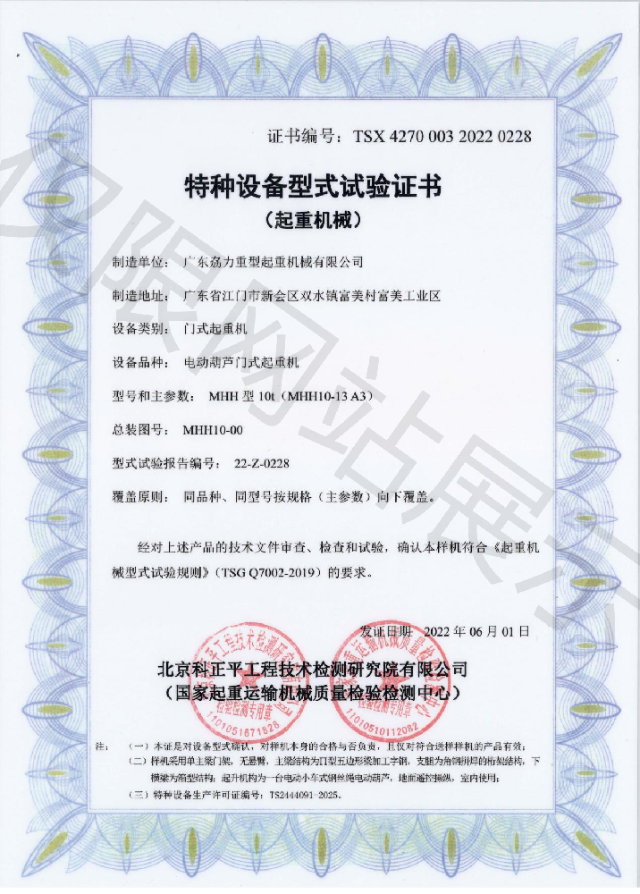 特種設備型式試驗證書--電動葫蘆門式起重機